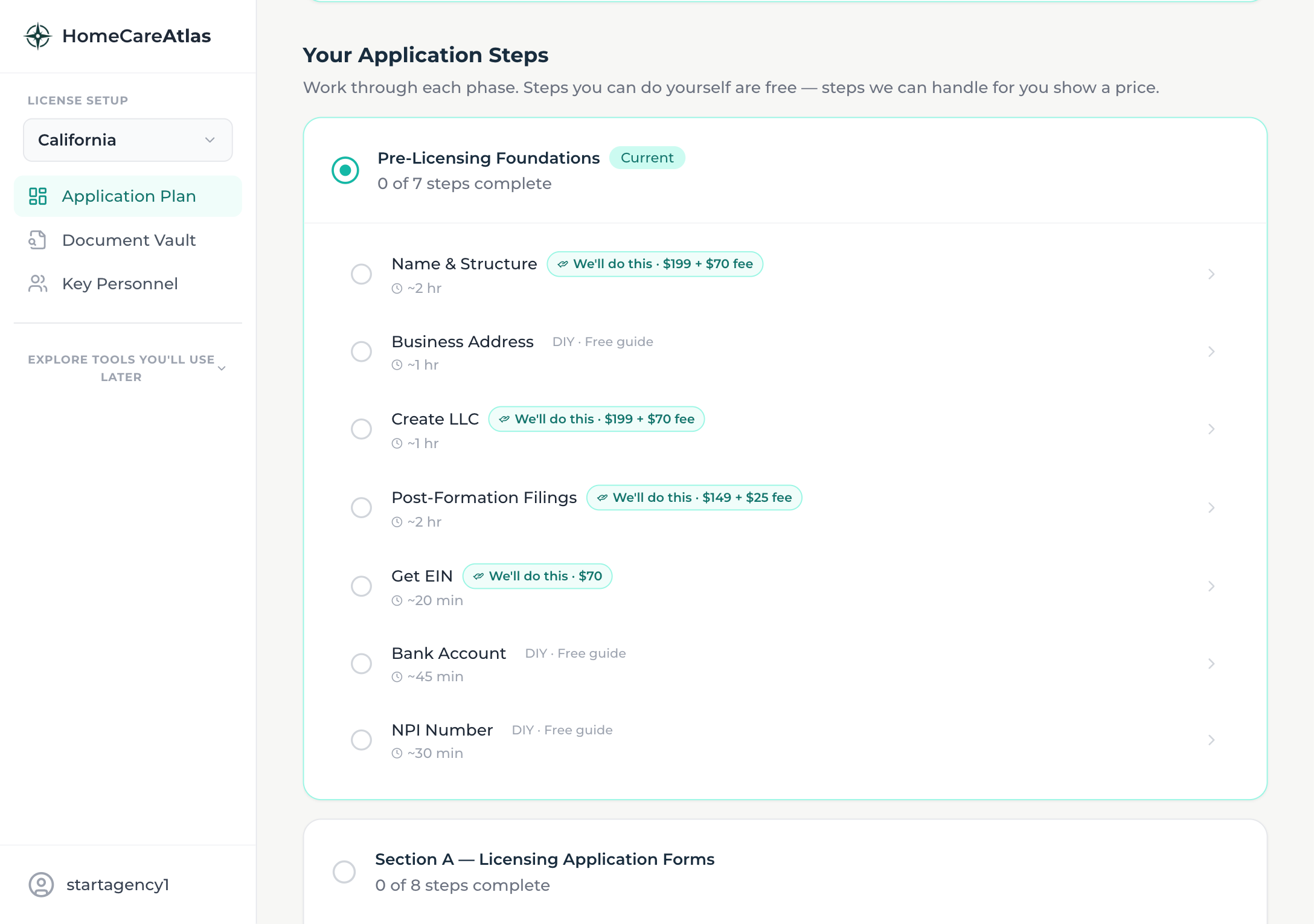 Business entity, EIN, insurance, and NPI — every foundational step is listed and tracked so you never wonder what you forgot.